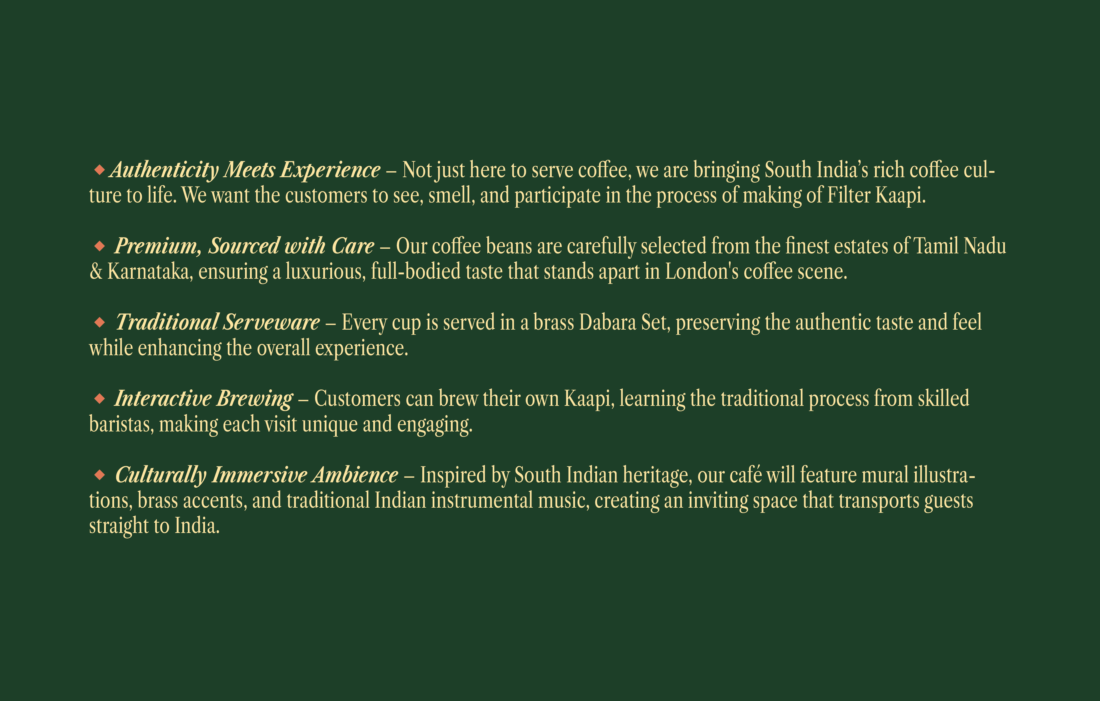 Our Vision is clearly to create a space where people get to have an experience on the artistry behind every drop of south indian style coffee while at the same time fostering a deep appreciation for its old history and ways of preparing it. Our strong mission is to provide an essence and the blend of taste,tradition and educate people , making each visit a memorable Journey into the world of South India coffee craftsmanship.