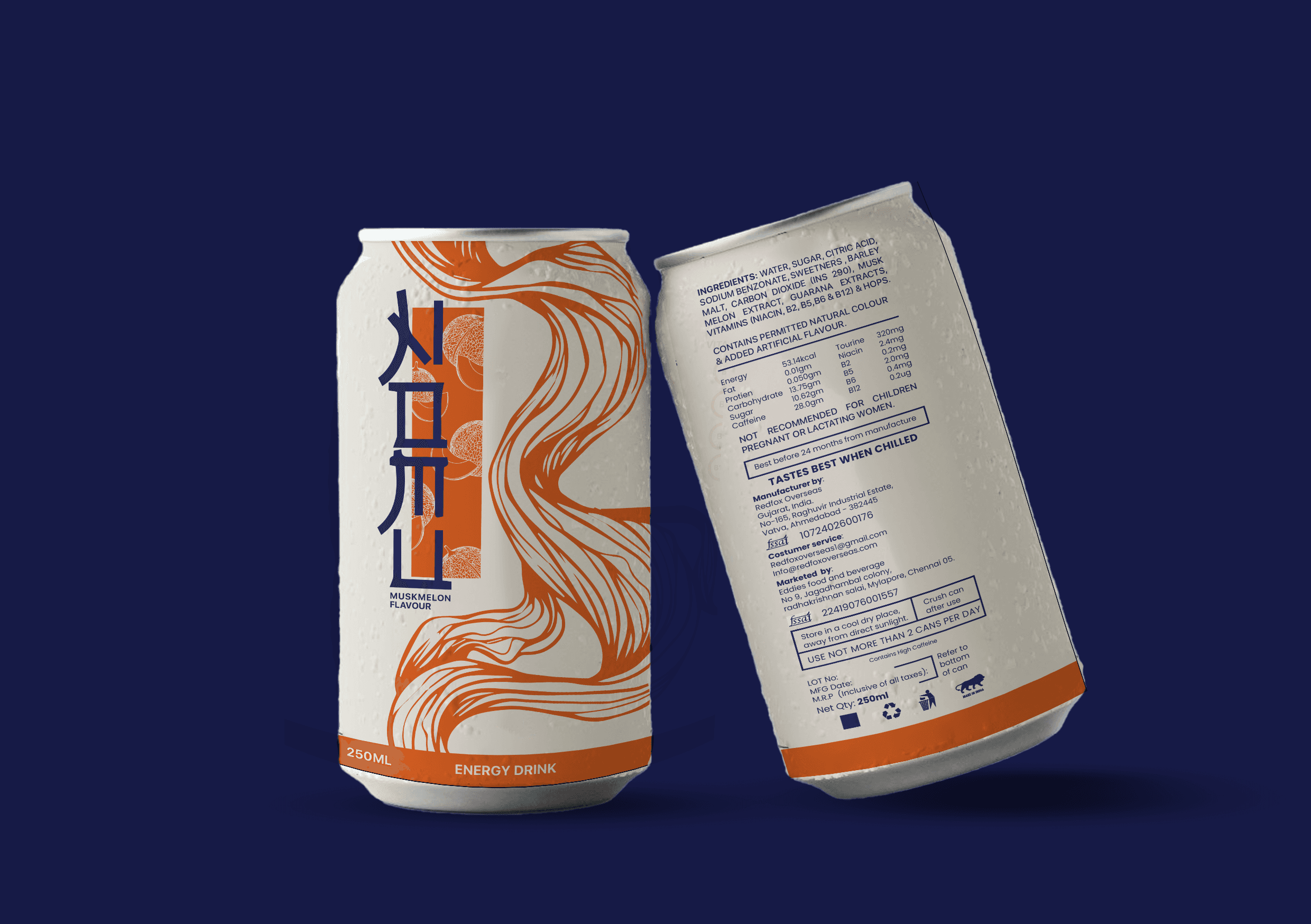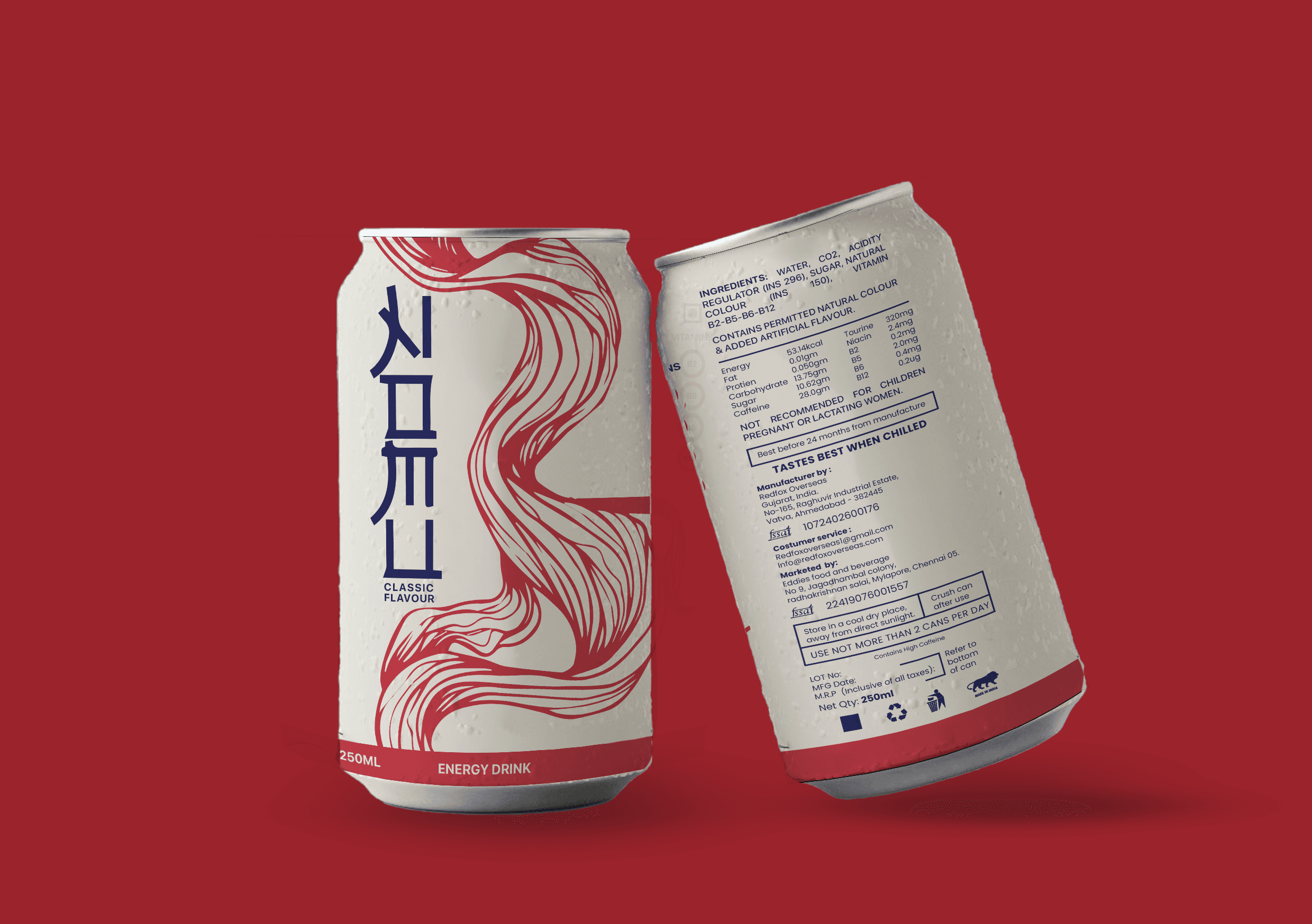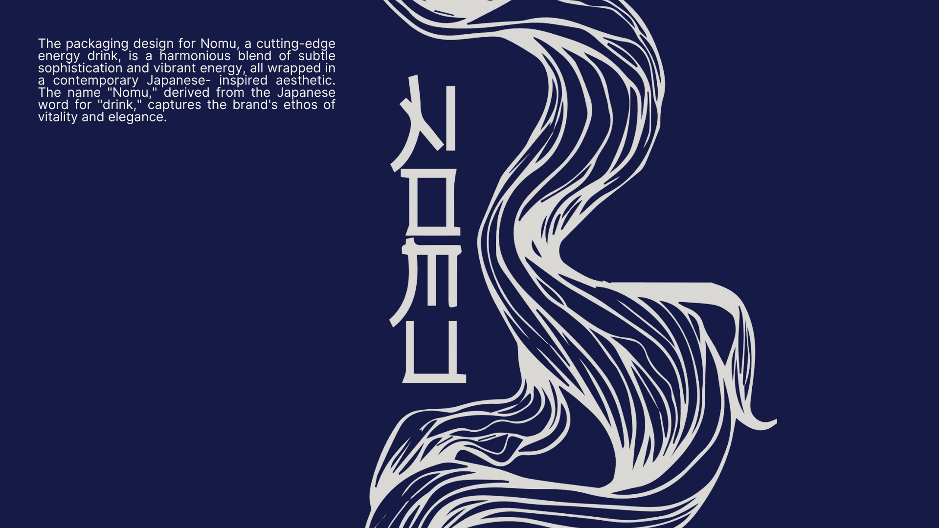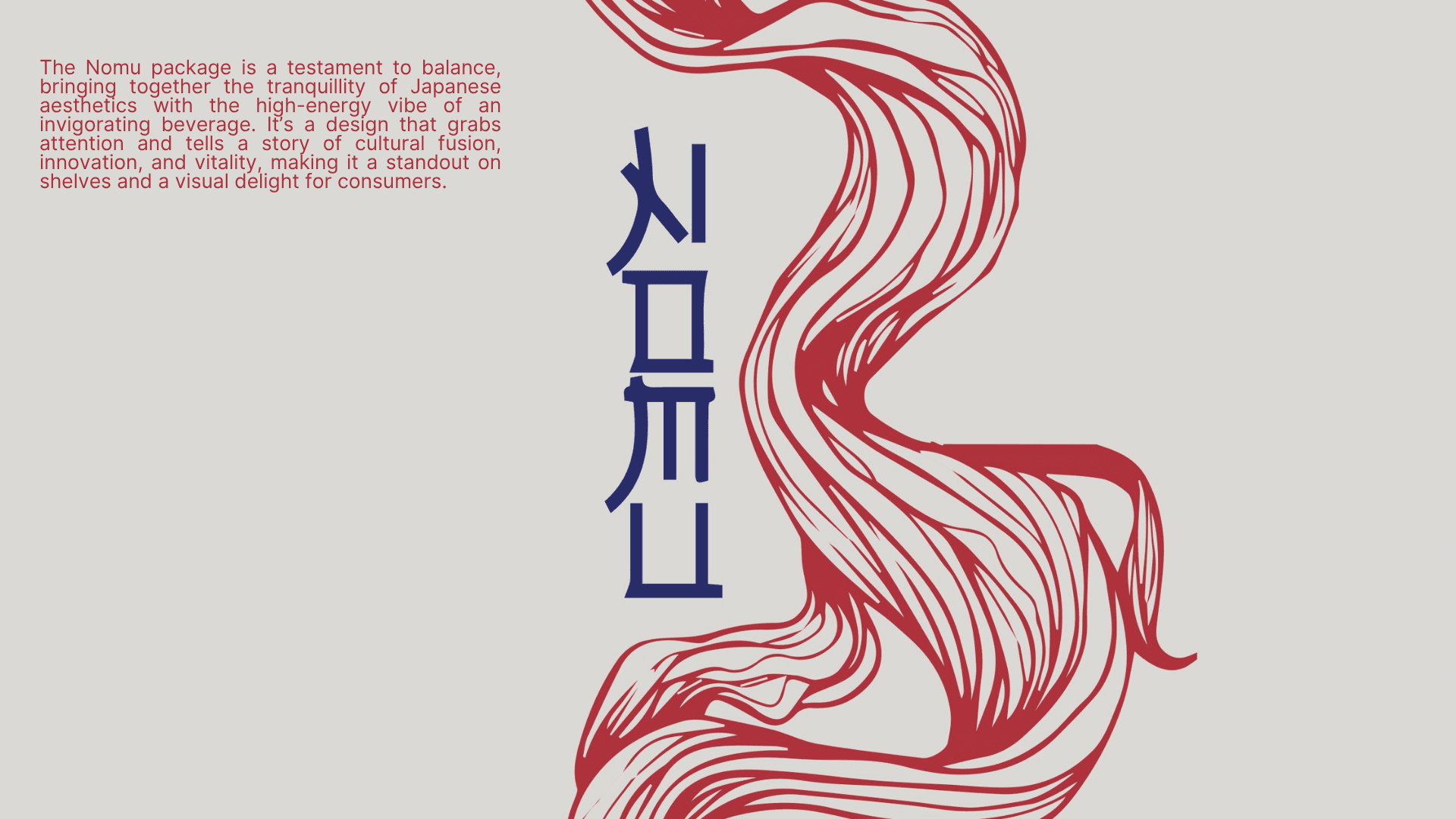 The packaging design for Nomu energy drink reflects a fusion of minimalism and vibrancy, inspired by Japanese aesthetics. The off-white base provides a clean and calming canvas, while the flowing red brushstroke patterns evoke a sense of dynamic energy and movement. The vertical typography, reminiscent of traditional Japanese kanji, adds an authentic cultural touch while maintaining a contemporary look. The design balances subtlety and boldness, creating a visually striking yet elegant identity for the product. Every detail, from the harmonious color, contrasts to the thoughtful typography placement, communicates the essence of vitality and sophistication.